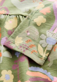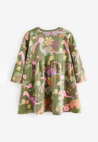 Robe verte à manches longues pour tout-petit avec des motifs colorés de dinosaures et de fleurs en rose, violet, orange et jaune.