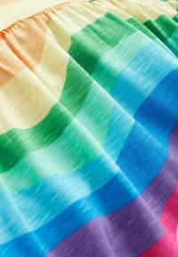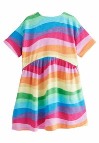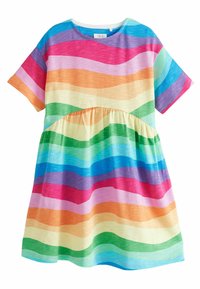 Robe colorée à manches courtes avec des rayures ondulées dans des teintes variées : orange, rose, violet, vert et bleu. Fabriquée en tissu léger.
