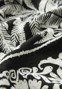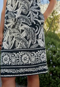 Femme portant une robe sans manches à motifs noirs et blancs et des sandales noires à brides, tenant un sac noir texturé, debout à l'extérieur sur des marches.