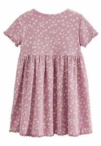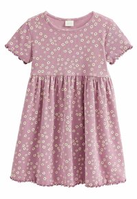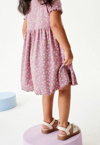Robe lavande avec motif floral blanc, manches courtes et ourlet festonné. Associée à des sandales blanches avec un design ajouré.