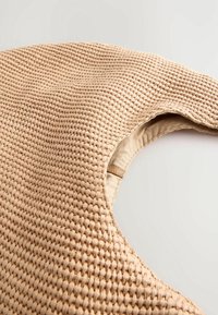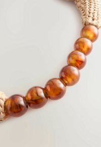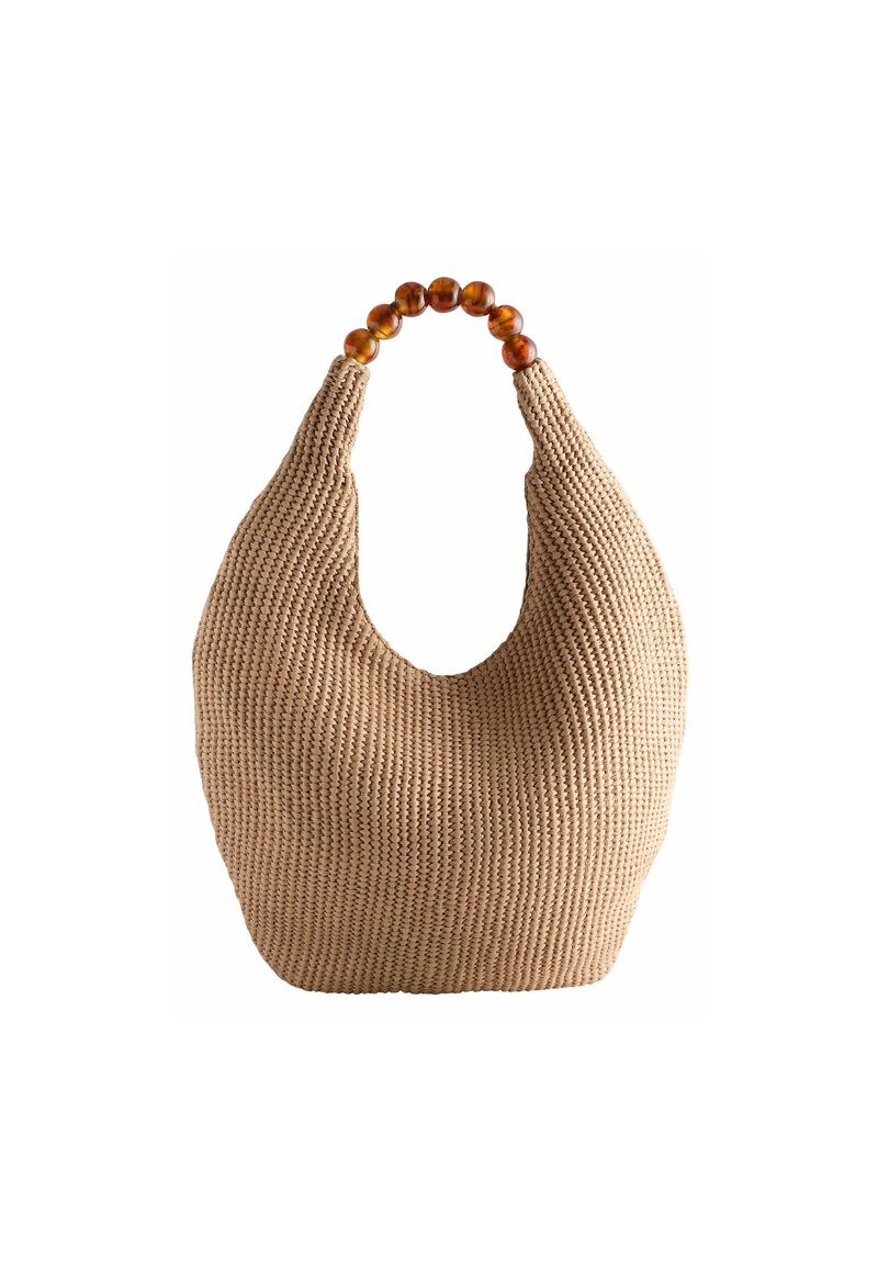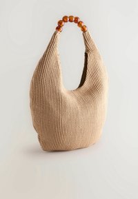 Sac tissé beige en forme de hobo, avec une surface texturée et une poignée arrondie ornée de perles ressemblant à de l'ambre.