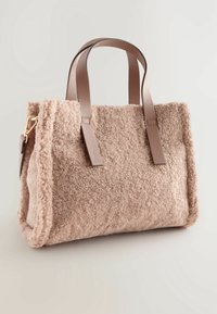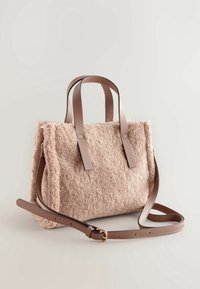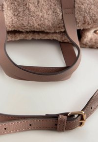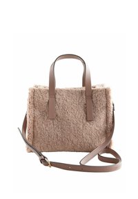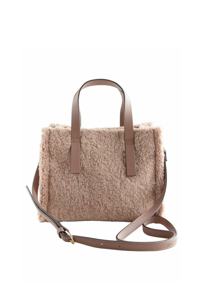 Sac à main rectangulaire en sherpa taupe avec deux poignées en cuir et une bandoulière longue en cuir réglable avec boucle dorée.