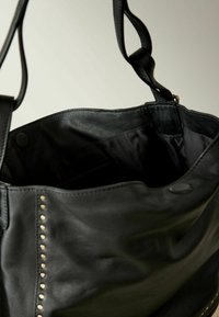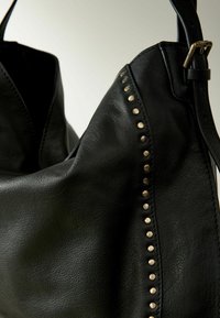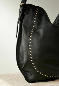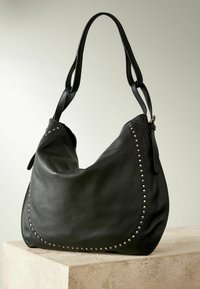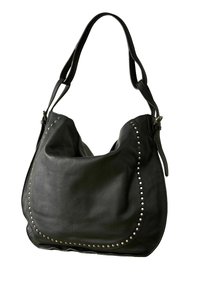 Sac à bandoulière en cuir noir à forme incurvée, orné de clous argentés le long des bords avant, avec une sangle réglable à boucle sur les côtés.