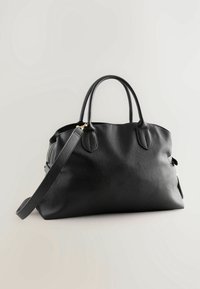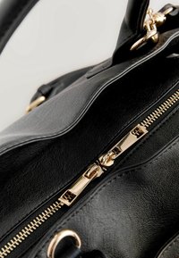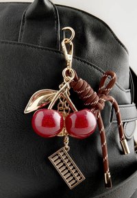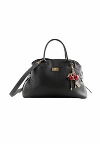 Sac à main en cuir noir avec deux poignées, une bandoulière amovible, une fermeture dorée et un porte-clés en forme de cerise rouge.