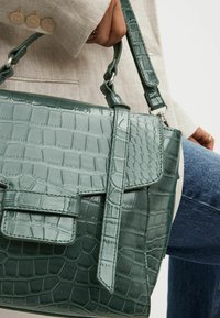 Sac à main vert à texture crocodile avec rabat et détail boucle, tenu par une personne portant un blazer en lin beige.