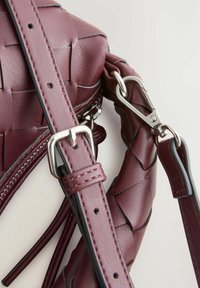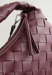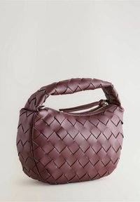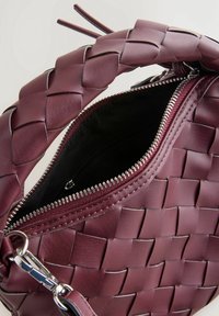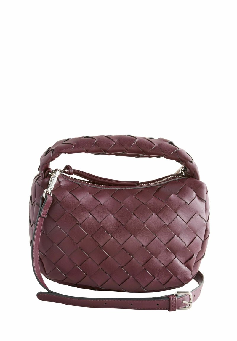 Petit sac à main en cuir bordeaux avec texture tissée, poignée supérieure, fermeture éclair et bandoulière réglable.