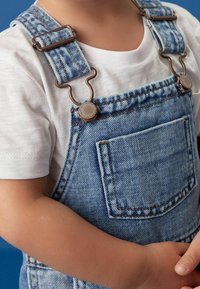 Tout-petit portant une salopette en jean clair, un t-shirt blanc et des baskets blanches, debout sur une plateforme en bois clair devant un fond bleu.