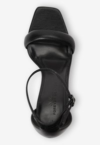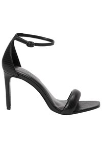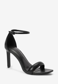Sandales à talons noirs avec une bride de cheville, présentant une finition texturée, un design à orteils ouverts et un talon aiguille fin.