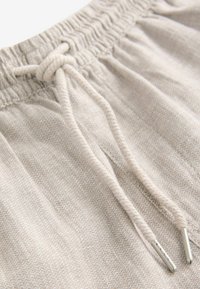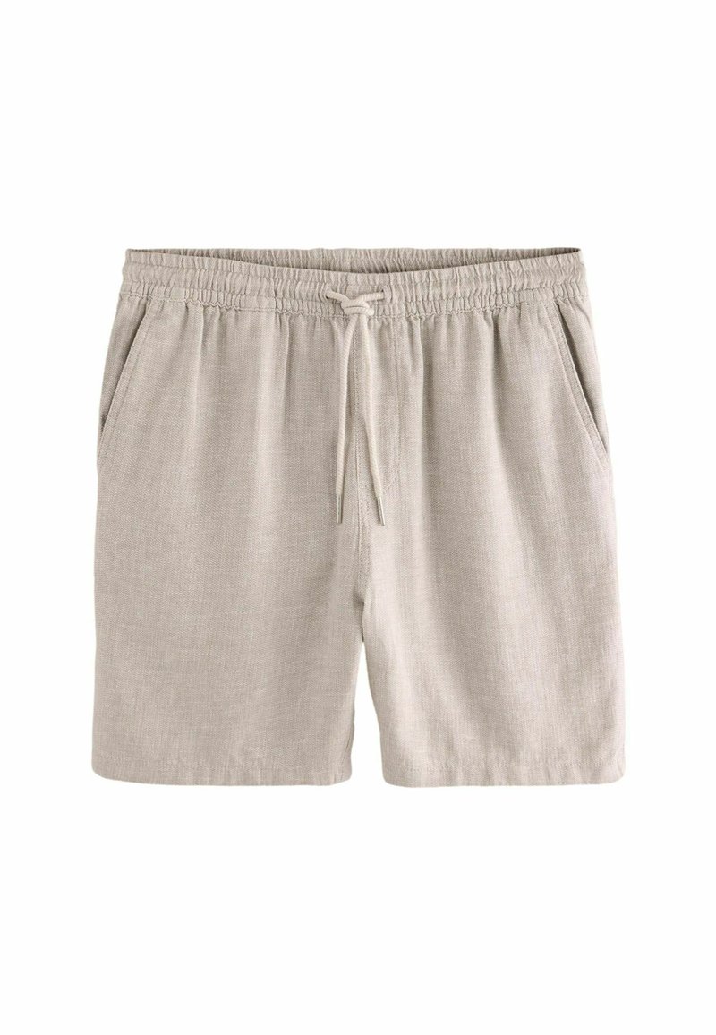 Shorts en lin de couleur beige clair avec une taille élastique et un cordon de serrage, dotés de deux poches latérales et d'une texture lisse.