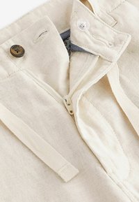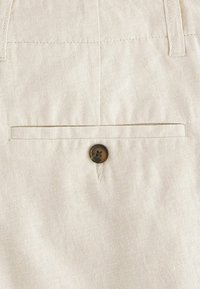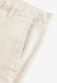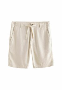 Shorts en lin blanc avec deux poches arrière, chacune dotée d'un bouton marron. Les shorts sont associés à un pull texturé bleu clair.