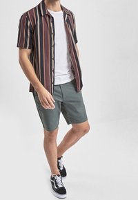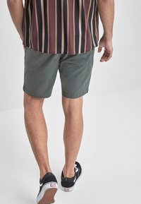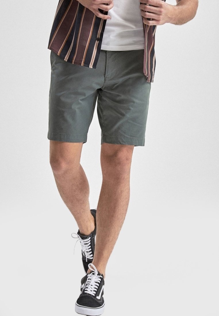 Shorts en coton vert à coupe droite, associés à des baskets noires avec des lacets blancs. Texture sans plis, sans motifs visibles.