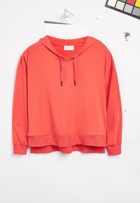 Sweatshirt à capuche corail avec cordons, coupe décontractée, ourlet côtelé, associé à un legging bleu avec un motif léopard noir. Sac bandoulière en corail.