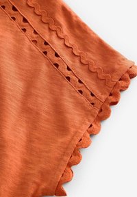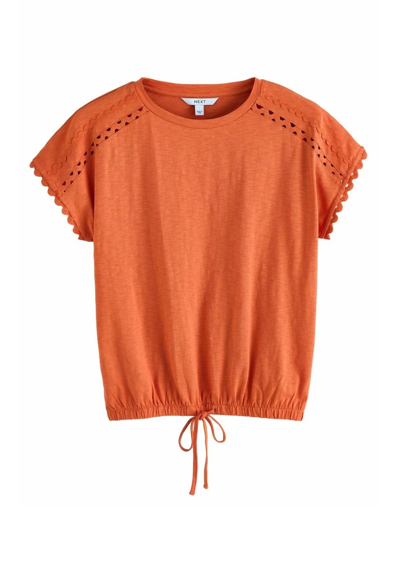 Blouse orange à manches courtes avec bordure en dentelle festonnée sur les épaules, col rond et ourlet ajustable avec cordon.