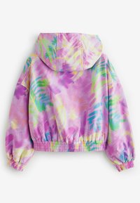 Veste courte légère en rose pastel avec un motif floral vert et violet. Dotée d'une capuche, de poignets élastiques et de poches avant.