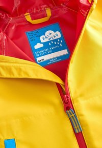 Veste de pluie jaune pour enfants avec capuche, fermeture éclair rouge, doublure rouge et accents de poche bleus, présentée sur un fond blanc.