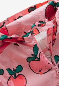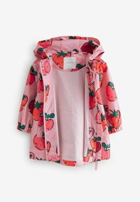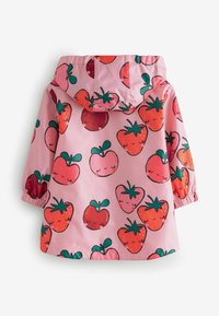 Veste imperméable rose ornée d'un motif de fruits souriants, principalement des fraises et des cerises, avec des poignets élastiques et une capuche.