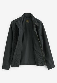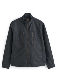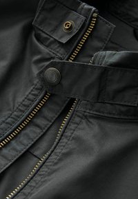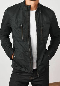 Homme portant une veste noire dézippée avec des poches sur la poitrine et les côtés, par-dessus un t-shirt blanc et un jean foncé, les mains dans les poches inférieures.