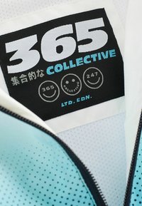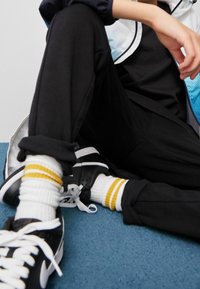Personne assise sur un sol bleu, portant un pantalon noir, des baskets noires et blanches, des chaussettes blanches à rayures jaunes, et une veste bleu clair et blanche.