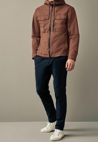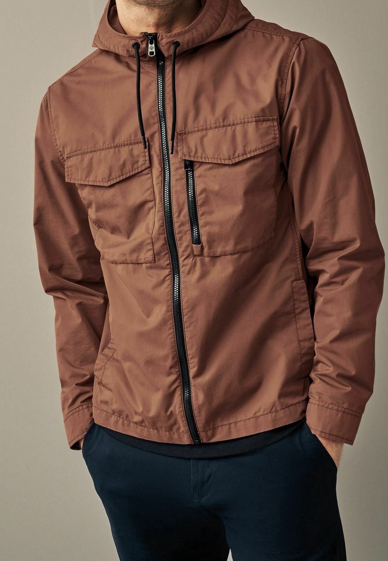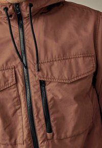 Homme portant une veste marron à capuche avec fermeture éclair frontale, poches poitrine à rabat et cordons noirs, associé à un pantalon foncé, debout les mains dans les poches.