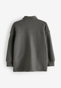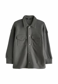 Chemise ample grise foncée à boutons, fabriquée en tissu doux, dotée de deux poches avant, d'un col pointu et de boutons-pression.