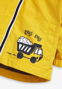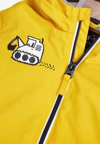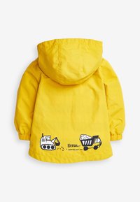 Veste imperméable jaune avec capuche, ornée de graphiques de véhicules de construction et de poignets élastiques. Fermeture à glissière à l'avant et deux poches latérales.
