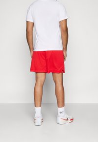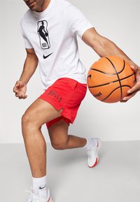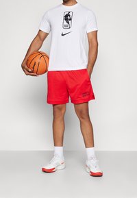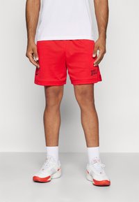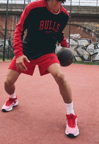 Tenue de sport rouge et noire comprenant un haut à manches longues et un short en maille avec le logo "BULLS" ; accompagné de chaussures rouges Nike et de chaussettes blanches.