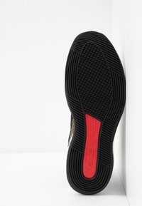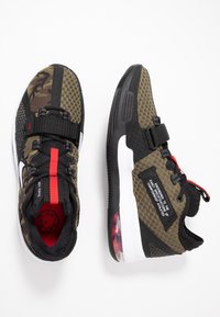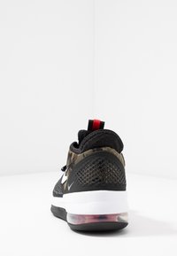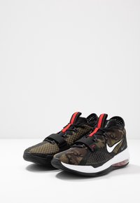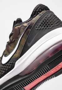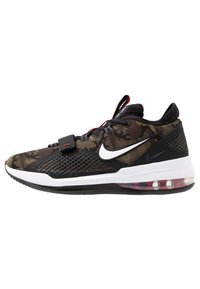 Chaussure de sport camouflage noire et olive avec tige en mesh, semelle intermédiaire blanche et unité d'air visible au talon. Comprend une sangle et un système de fermeture à lacets.