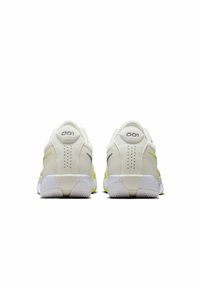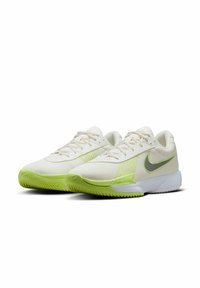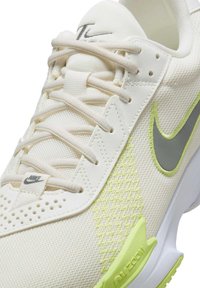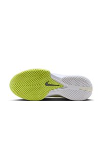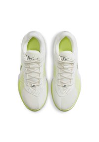 Baskets en maille blanche avec des accents vert citron. Elles présentent un logo gris, un panneau latéral texturé et une semelle en caoutchouc blanche.