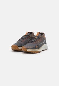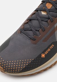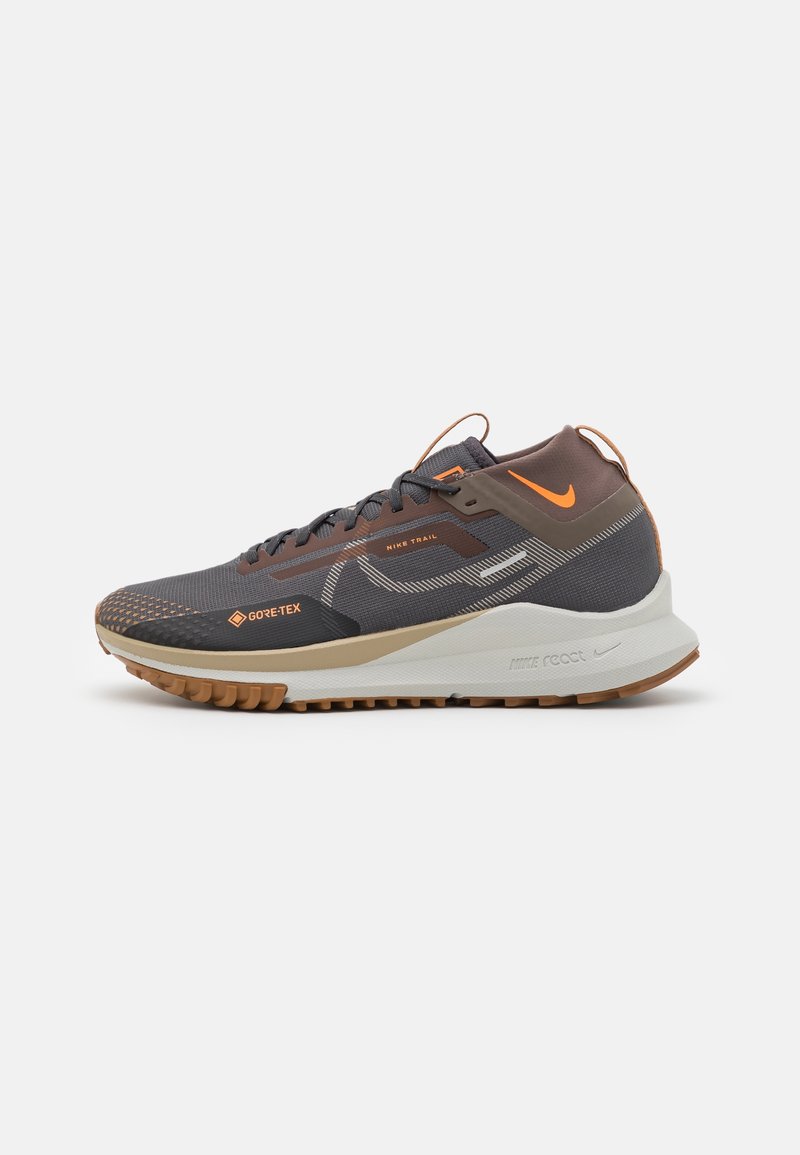 Chaussures de course GORE-TEX avec une tige en mesh gris foncé, des accents orange, une semelle intermédiaire blanche amortissante et une semelle extérieure en caoutchouc brun texturée.