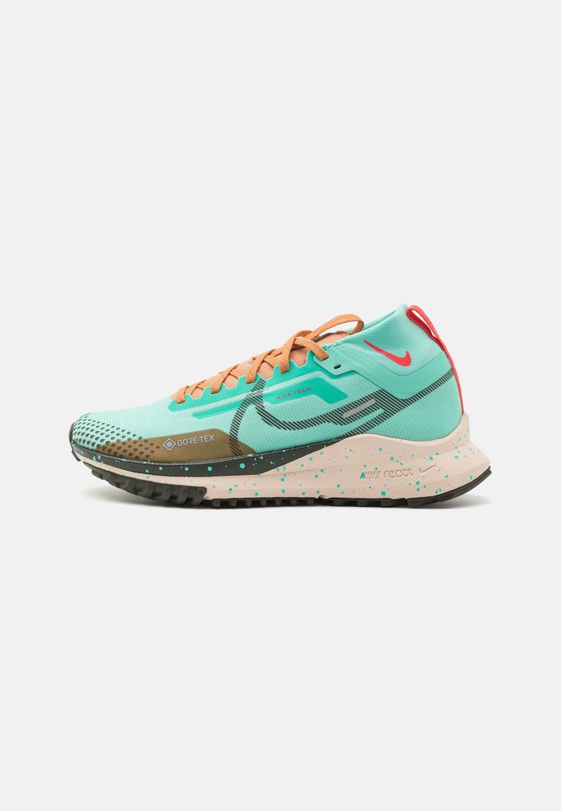 Chaussure de running Nike avec une tige turquoise, des lacets orange et des accents noirs. Caractérisée par un matériau Gore-Tex et une semelle tachetée blanche, noire et verte.