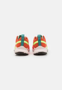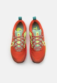 Chaussure de course sur sentier rouge avec une tige en maille texturée, accents jaune néon, languette vert menthe et semelle extérieure en caoutchouc noir. Dispose d'une semelle intermédiaire rembourrée.