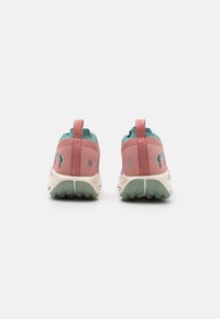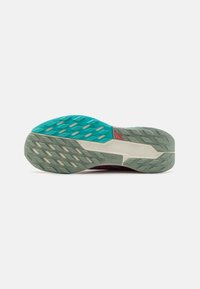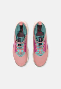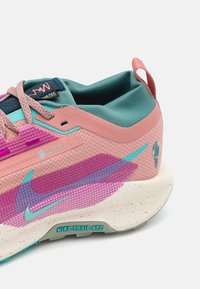 Chaussure de sport rose et bleu-vert avec un dessus texturé, dotée d'un swoosh violet et d'une semelle mouchetée, conçue pour la course en trail.