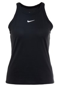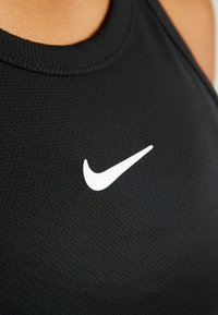 Athlète portant un débardeur noir Nike et une jupe noire assortie, debout avec les mains sur les hanches devant un fond uni.