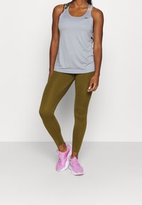 Femme portant un débardeur Nike gris clair et des leggings vert olive, posant avec une main touchant ses cheveux et l'autre détendue.