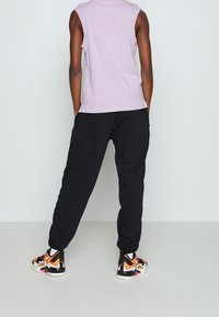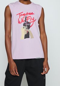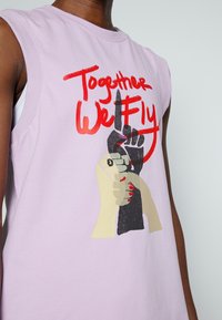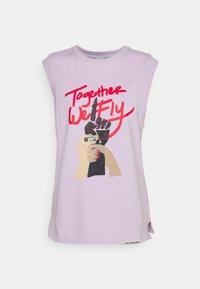 T-shirt sans manches couleur violet clair avec un design graphique montrant des mains et le texte "Together We Fly" en tons rouges, noirs et beiges.