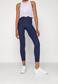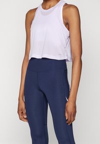 Haut court en maille violet clair avec un col arrondi, superposé à un débardeur blanc. Associé à des leggings taille haute bleu marine foncé avec des accents latéraux.