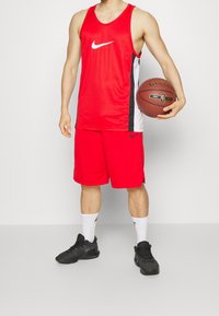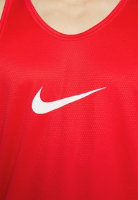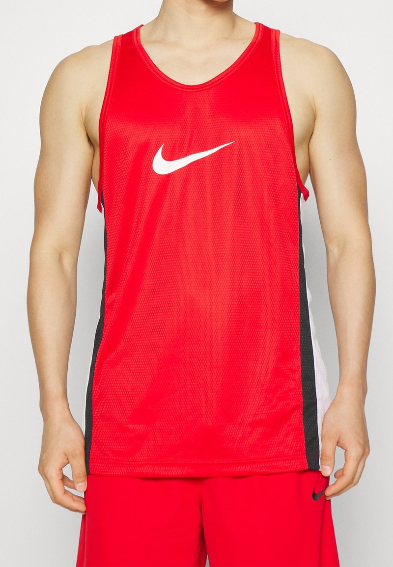 Homme portant un maillot de sport rouge sans manches et un short assorti avec des bandes latérales noires et blanches, logo Nike centré sur la poitrine et le short.
