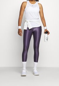 Femme portant un débardeur Nike blanc et un legging Nike violet brillant, debout devant un fond clair uni.