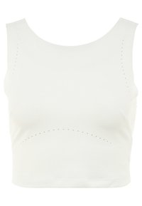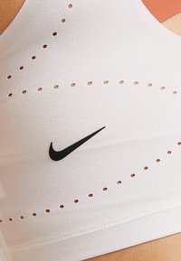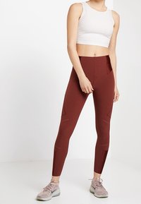 Femme portant un haut de sport blanc court et des leggings taille haute couleur rouille, main posée sur la hanche.