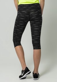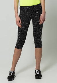 Femme portant un t-shirt à manches courtes jaune néon, des leggings capri à motifs noir et blanc, et des chaussures de course noires sur un fond uni.