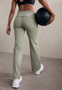 Pantalon de sport vert en matière extensible, doté d'une large ceinture, accompagné d'un medicine ball noir et de baskets blanches.