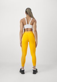 Leggings de sport jaunes avec une taille haute, présentant une texture lisse et un logo Nike discret. Associés à des chaussures de sport noires.