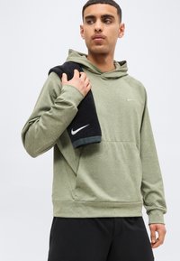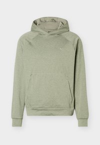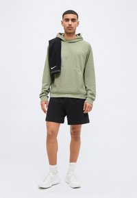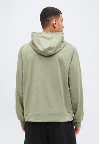 Jeune homme aux cheveux courts portant un sweat à capuche vert clair et un pantalon noir, sur un fond clair uni.