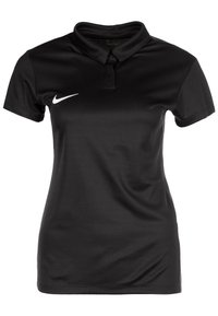Polo noir à manches courtes avec col, patte de boutonnage et logo Nike Swoosh blanc sur le côté droit de la poitrine.