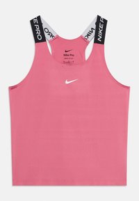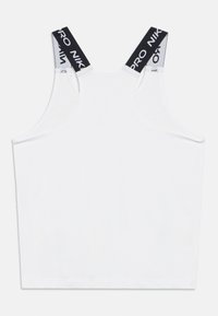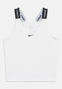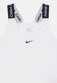 Débardeur Nike Pro blanc avec logo noir. Présente des bretelles larges avec le texte « NIKE PRO », un col arrondi et une texture de tissu lisse.