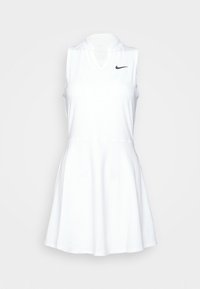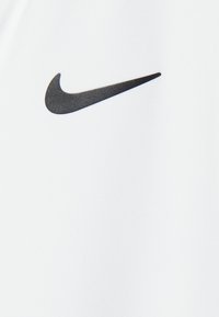 Haut de sport blanc sans manches avec col en V et logo Nike swoosh noir sur la partie supérieure gauche de la poitrine sur fond uni.
