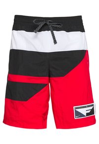 Shorts rouges, noirs et blancs avec une finition texturée, dotés d'une taille élastique, d'un cordon de serrage et d'une poche latérale avec une étiquette.