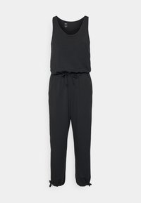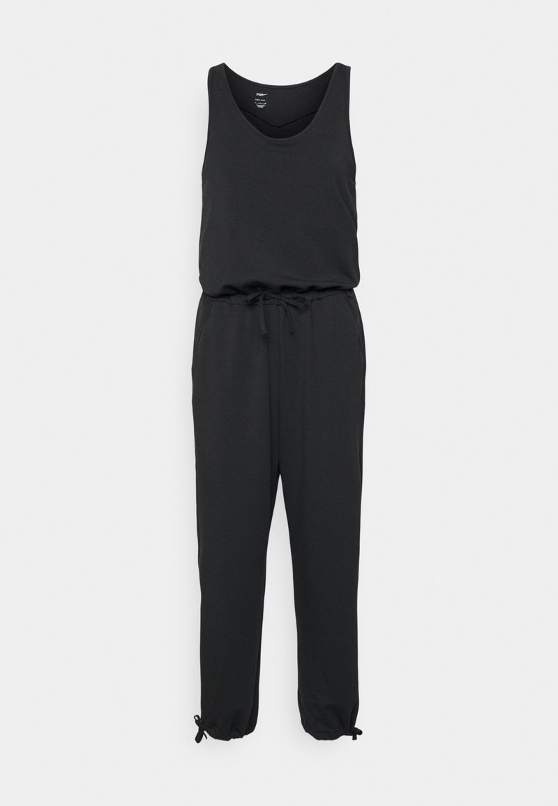 Combinaison noire avec un haut sans manches, une taille à cordon de serrage et des jambes fuselées. Présente des poignets élastiques avec des liens ajustables. Tissu doux et extensible.