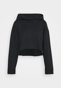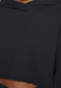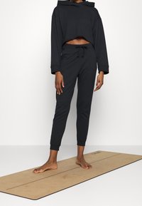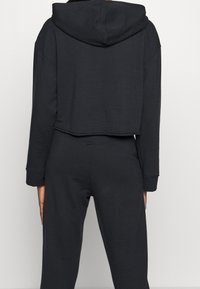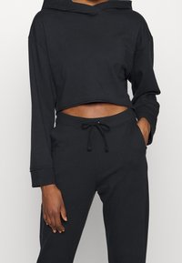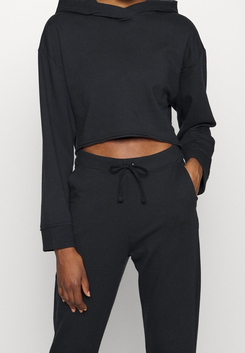 Personne portant un sweat à capuche court noir et un pantalon de survêtement noir à cordon, avec une main dans la poche et le ventre nu visible.
