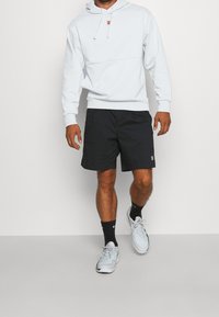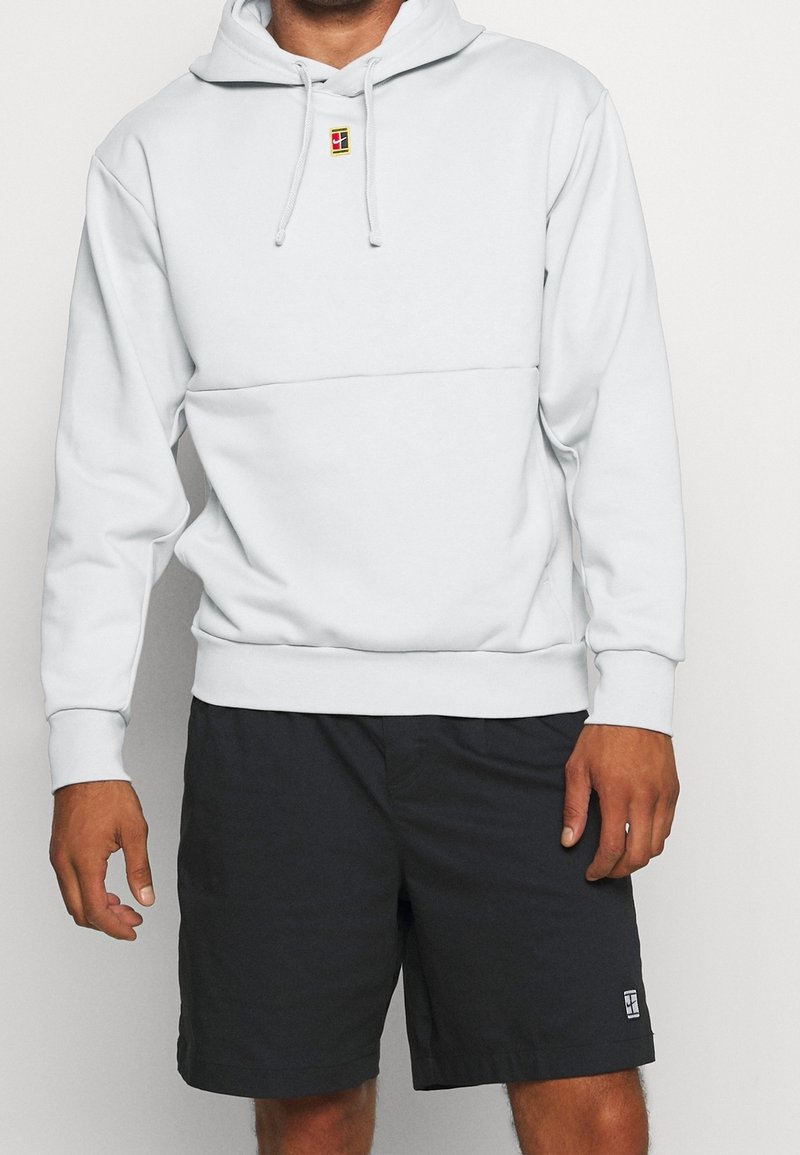 Personne portant un sweat à capuche blanc avec des cordons de serrage et un petit logo, associé à un short noir avec un petit patch sur la jambe gauche.